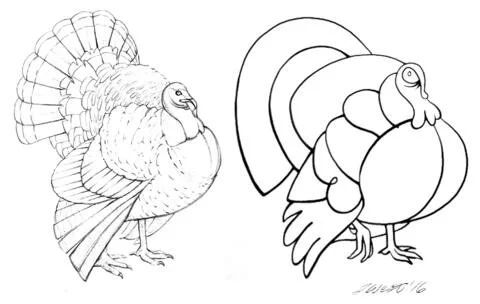 I began with some detailed drawings of turkeys from reference photographs on Google. From there, I endeavored to simplify the creatures to their basic forms through expressive lines and minimal detail. Here you can see one of my detailed turkey portraits next to the simplified version: